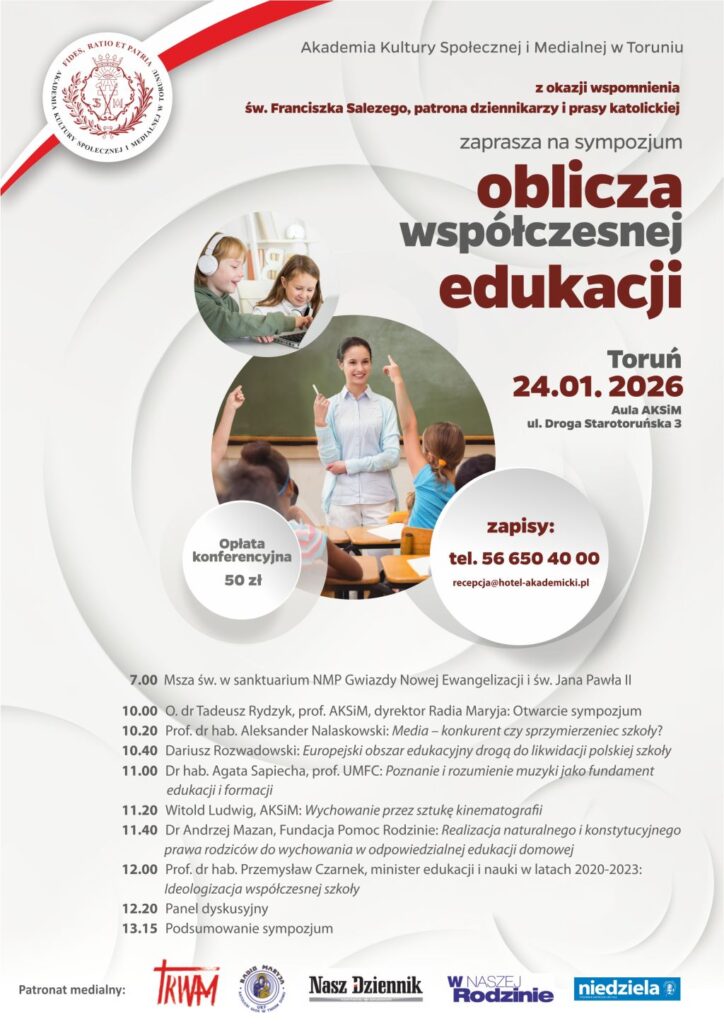 Akademia Kultury Społecznej i Medialnej w Toruniu zaprasza do udziału w sympozjum „Oblicza współczesnej edukacji”, organizowanym z okazji wspomnienia św. Franciszka Salezego – patrona dziennikarzy i prasy katolickiej.